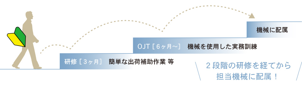 協和製作所には、未経験の方でも安心してステップアップできる仕組みがあります。 まずは簡単な作業補助から会社に慣れていき、必要な資格の取得(フォークリフト、クレーン、玉掛けなど)やOJTで基礎を学んだ後、先輩社員と共に徐々に機械加工を学んでいきます。 仕事を覚えていくと、ものづくりの楽しみ、自分で製品を作り上げた時の大きな達成感があります。また、ものの仕組みや裏側などを知ることができ、あなたの探究心や好奇心を刺激することと思います。 挑戦し続ける加工のプロを目指すあなたを応援します。